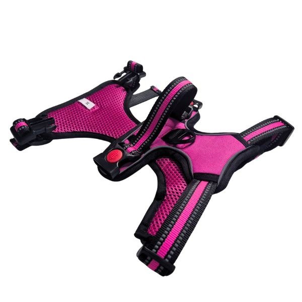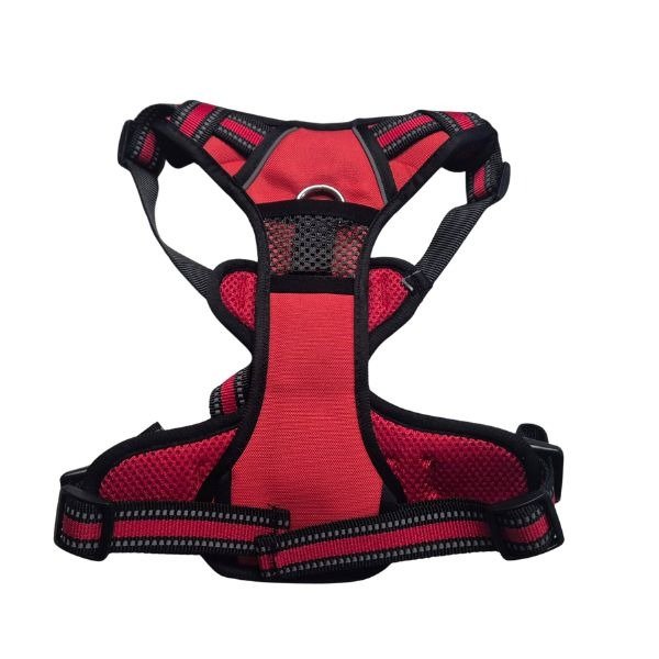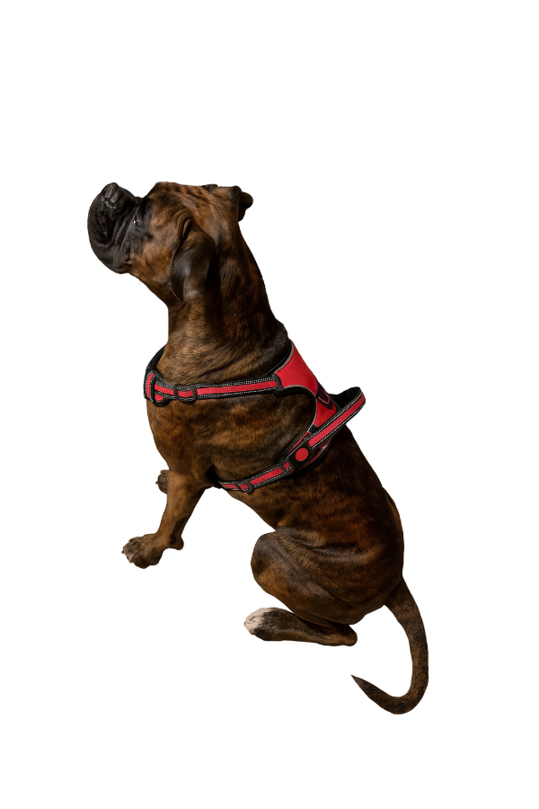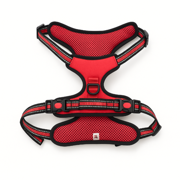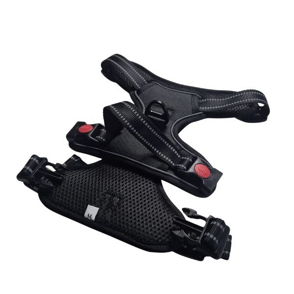 Posee dos enganches metálicos para la correa. Uno en la espalda y otro al frente.